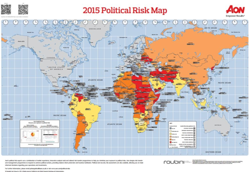 Respecto del mapa de 2015, Aon informó que hubo 19 países que presentaron un cambio en su clasificación de riesgos políticos, de los cuales 12 sufrieron un aumento en el nivel de riesgos políticos, según Rachel Ziemba, directora senior de mercados emergentes de Roubini Global Economics L.L.C., que reside en Londres y trabajó con Aon para la elaboración del mapa.